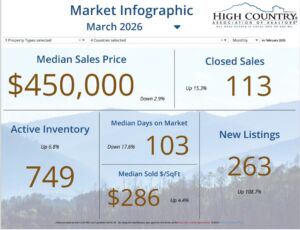 March 2026– MLS Report The High-Country Real Estate Market, which consists of Alleghany, Ashe, Avery, and Watauga counties, saw 113 closed sales of single-family, including condo/ townhouse properties, during March 2026, with a combined closing total of $ 81.5 million. A combination of median sales price of $450,000 included all four counties for March 2026.…