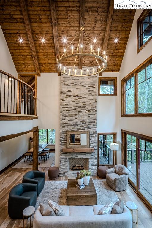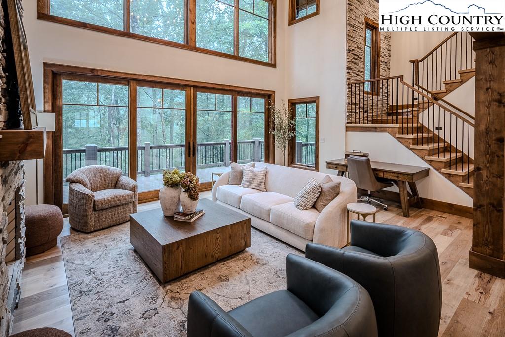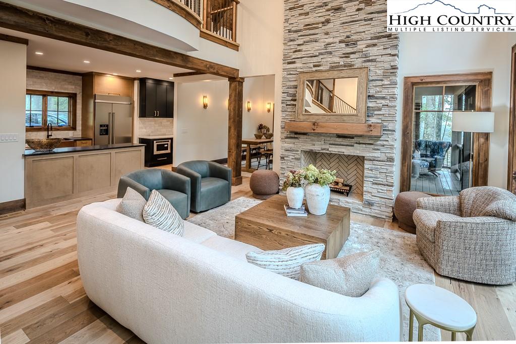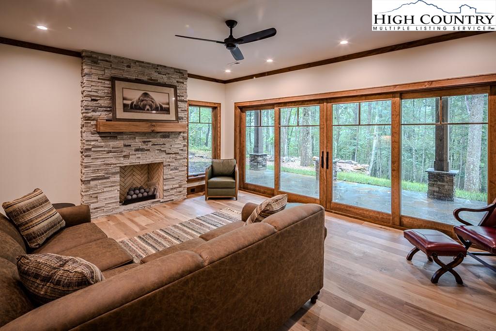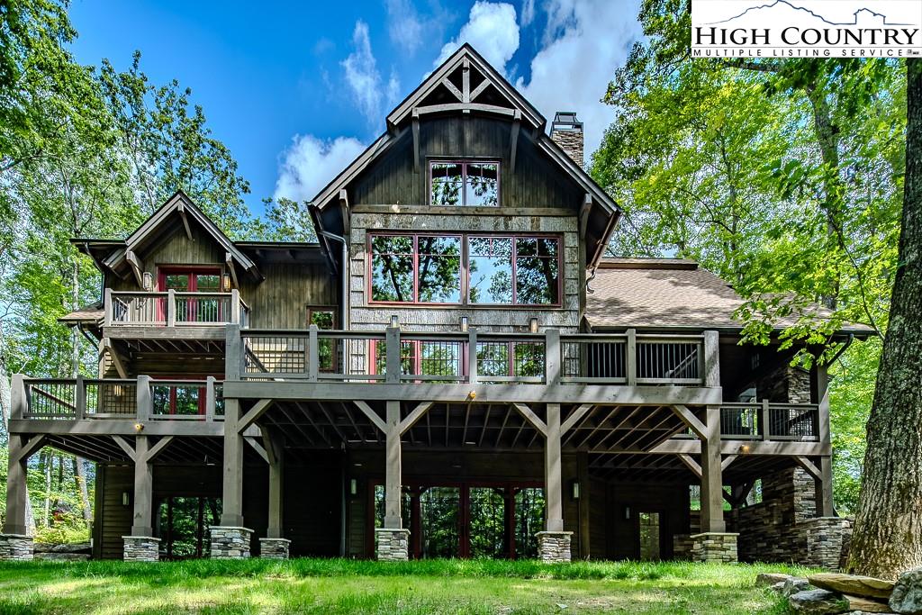 GORGEOUS BRAND NEW MOUNTAIN HOUSE AT BEAUTIFUL SWEETGRASS, BLOWING ROCK'S MOUNTAIN LAKE COMMUNITY! Just completed, this stunning home features dramatic vaulted spaces, well-used architectural timbers and materials and a very livable floor plan. Just steps away from the 22-acre Lake and Community Lake House and Fitness Center. Three handsome fireplaces including one on the covered deck. Very spacious rooms! One-level living but with room for all your guests. Large family room downstairs has its own fireplace, wine cooler, icemaker, and direct access to the stone patio and gentle back yard. All bedrooms are large. Lower level features an office/bonus room with direct access to the stone patio. Yard slopes down to one of Sweetgrass's wonderful walking trails along Boone Fork Creek. Furnishings package is available.