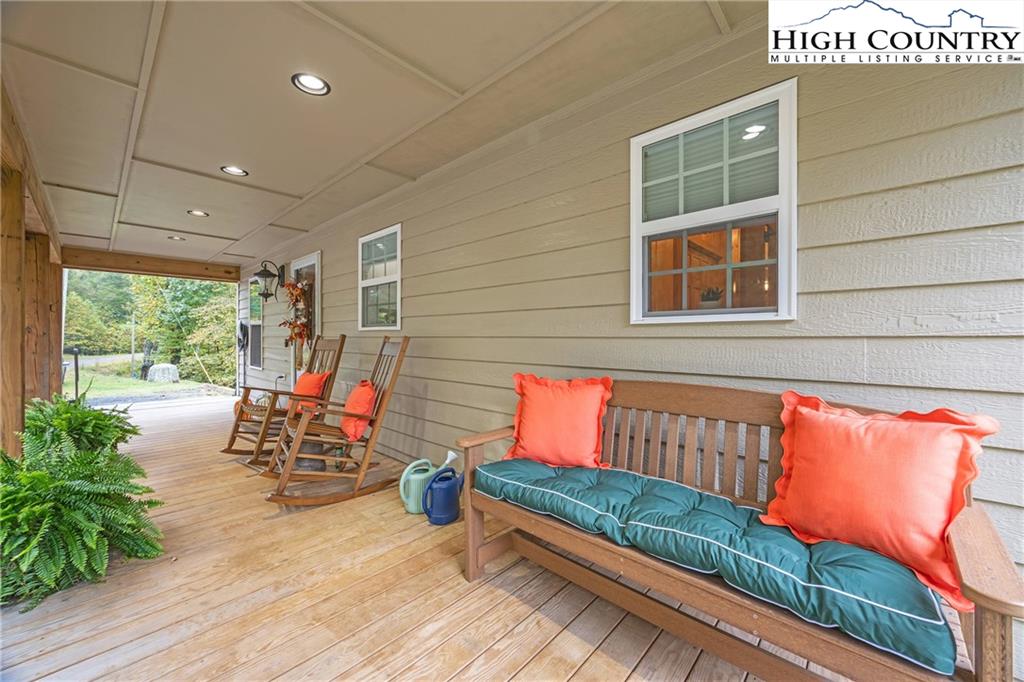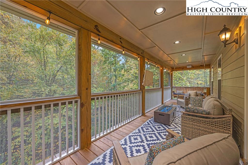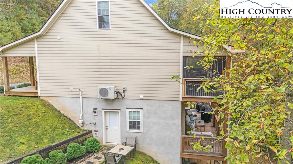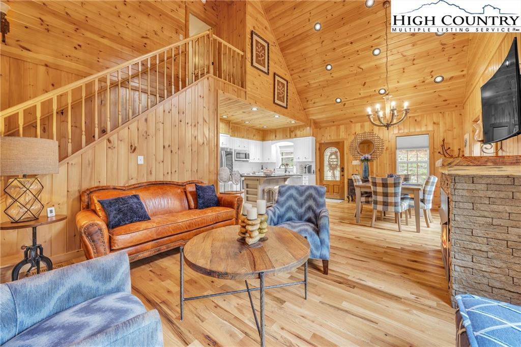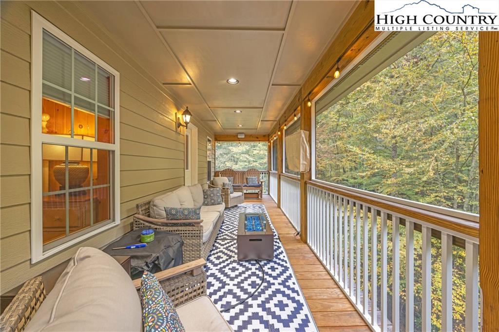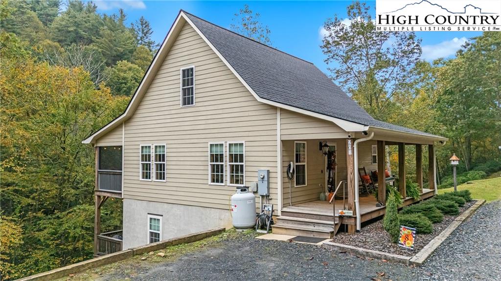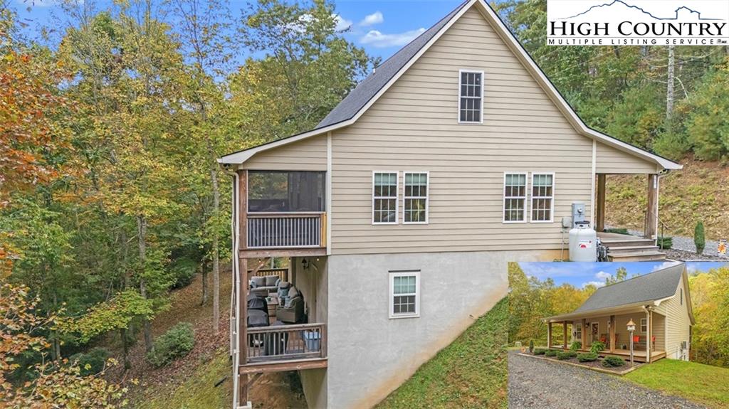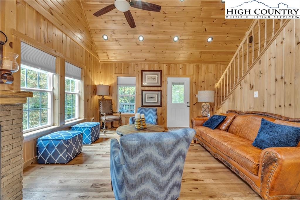 Immaculately maintained and tastefully decorated, this fully furnished 3BR/3BA mountain-style home is move-in ready—ideal as a primary residence, vacation retreat, or short- or long-term rental. A peaceful creek (not in flood zone) flows behind the house, providing serene sounds and a wooded setting that invites relaxation. Inside, discover gorgeous hardwood floors, light-filled tongue-and-groove walls and ceilings, and an open floor plan. The great room boasts a cathedral ceiling, a stunning stone veneer fireplace with gas logs, and a custom wood mantel. The updated kitchen features two-tone cabinetry, granite countertops, a spacious island, and stainless-steel appliances (note: the current refrigerator will be replaced). The main level includes the primary bedroom, full bath, and laundry, while a loft provides a second bedroom and bath. The walkout basement, recently finished, adds over 900 sq. ft. of heated living space including a family area, third bedroom, full bath, and double walk-in closets. Thoughtful upgrades include premium LVP flooring, dropped ceiling tiles, full insulation, and a new ductless mini-split heat pump. The basement opens to a private outdoor area along the creek. Outdoor living is exceptional with three levels of covered porches. The main-level screened porch is wired for surround sound, features a mounted TV, decorative lighting, and aluminum framing—perfect for entertaining. Railroad tie steps lead to the lower yard, enhanced by selective tree removal. Set on three combined lots, this property offers rare concealment with only a few neighboring homes. Abundant nearby trails and riding areas provide hiking and side-by-side adventures without hitting the highway. Parking is versatile: the existing area fits three cars, with additional space on the grassy area by the porch or along a dead-end path to the power lines for large trailers. Located just five minutes from the New River Access Park, this home perfectly combines mountain charm, privacy, thoughtful upgrades, and outdoor enjoyment. Fully furnished