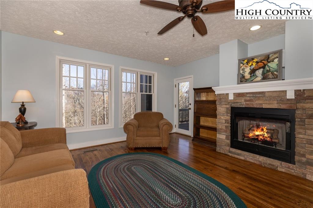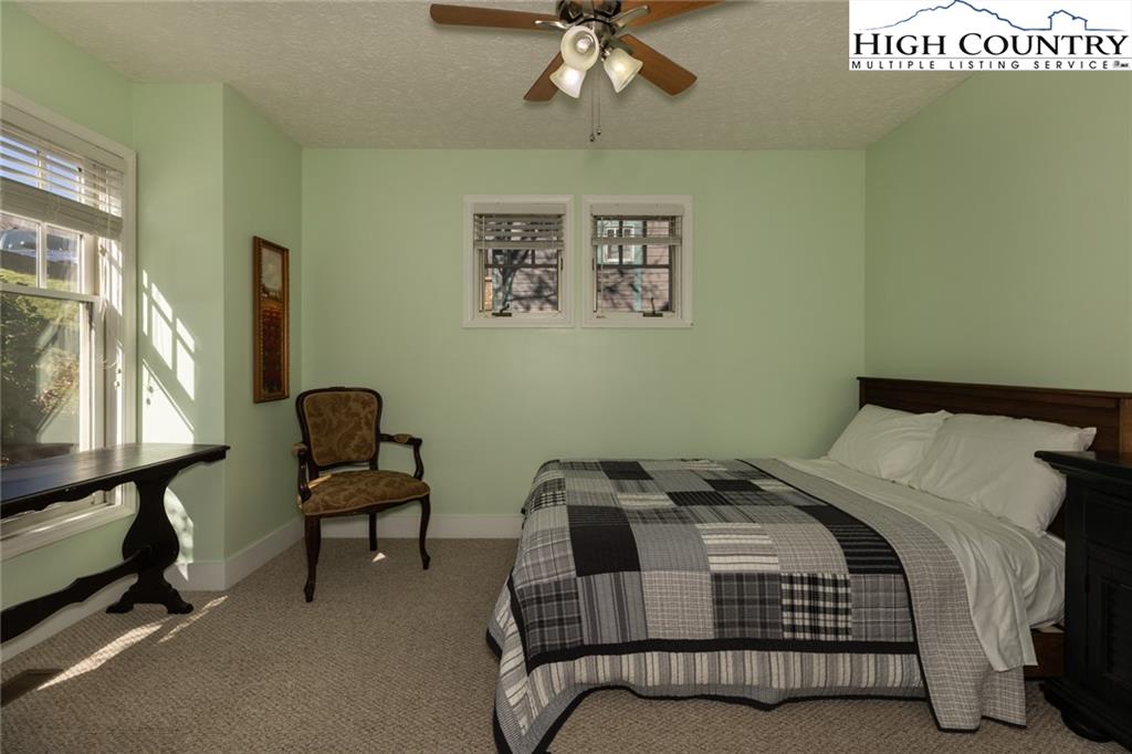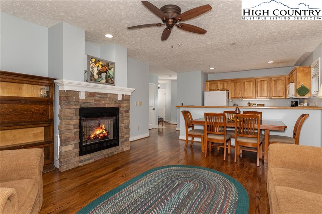 This spacious Evergreen condo features 2 bedrooms and 2 full bathrooms, providing comfortable accommodations within the secure, gated community of Echota in Foscoe. Its convenient location places you just 10 minutes from Boone, NC, Blowing Rock, NC, and Banner Elk, NC. Short-term rentals are allowed, making it ideal for Appalachian State University visits, ski vacations, or summer getaways. Quarterly POA (Property Owners Association) dues grant residents access to a wide array of amenities, including two clubhouses, two outdoor pools, one indoor pool, and three state-of-the-art fitness centers. Outdoor enthusiasts will appreciate the walking trails, a 25-acre riverpark, stocked fishing ponds, and a dog park. Recreational facilities also include pickleball courts and a secure gated entry. Additionally, basic cable and internet service are included in the POA fees. This lower-level unit is equipped with central HVAC for year-round comfort. The kitchen features a breakfast bar that seamlessly opens to the combined living and dining room area. Large windows fill the space with natural light, and a gas fireplace creates a warm, inviting atmosphere. A private outdoor balcony is also accessible from the main living area and the primary bedroom. A newly opened amenity center, The Summit at Echota, is available exclusively for new owners. This facility includes an outdoor pool, a skybridge, and a modern fitness center, providing additional opportunities for relaxation and recreation. With its comprehensive amenities and maintenance-free living, this Echota condo is an exceptional choice for those seeking the perfect mountain retreat.