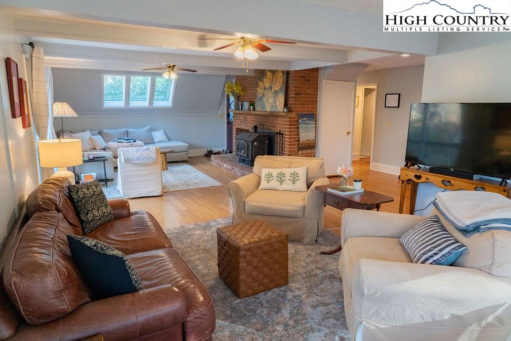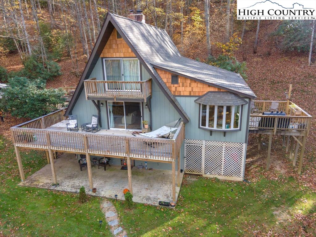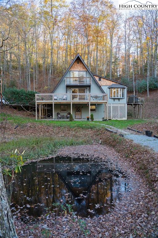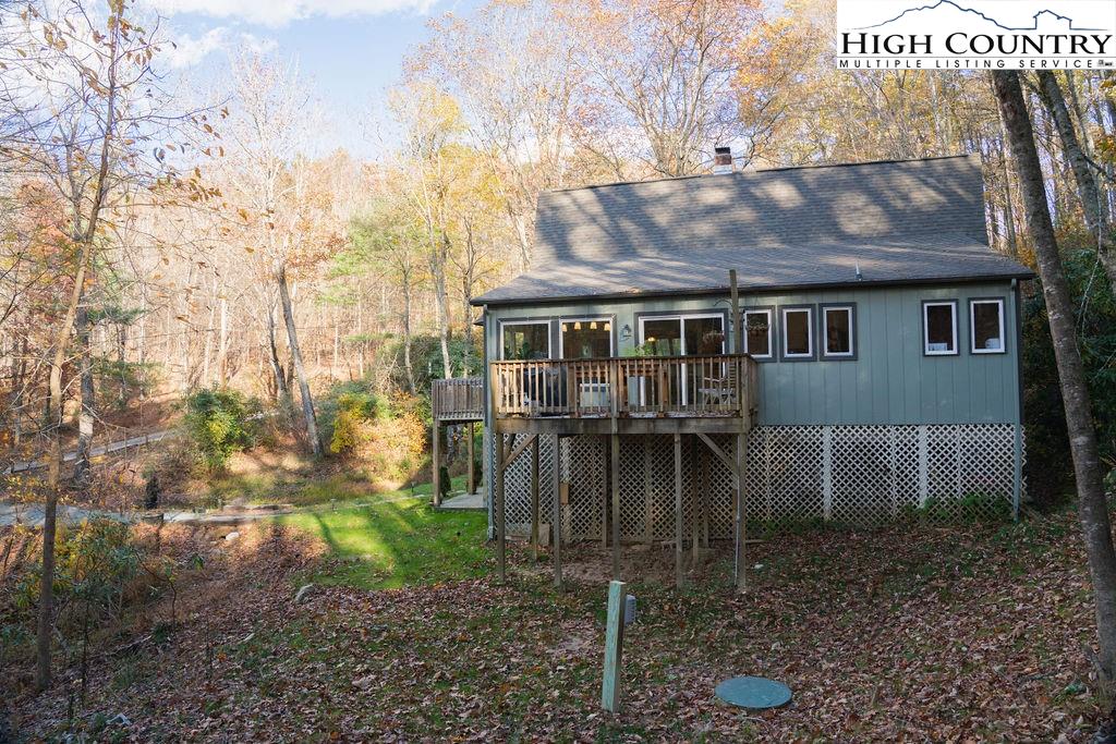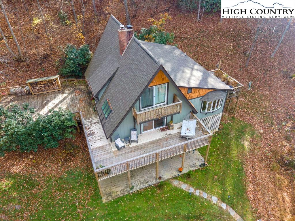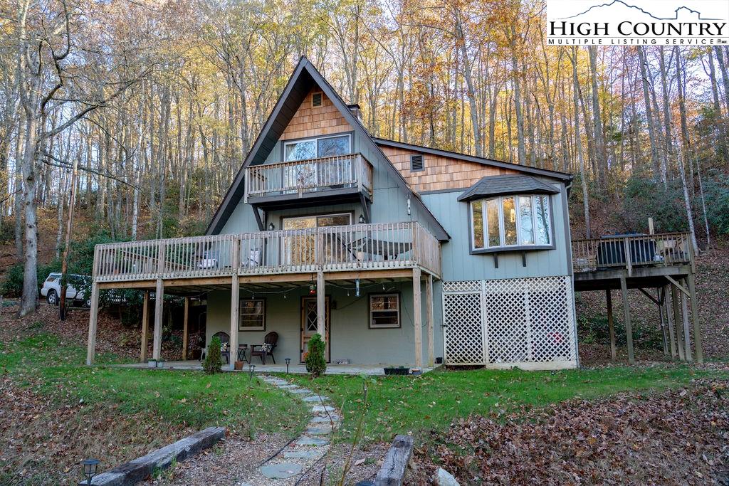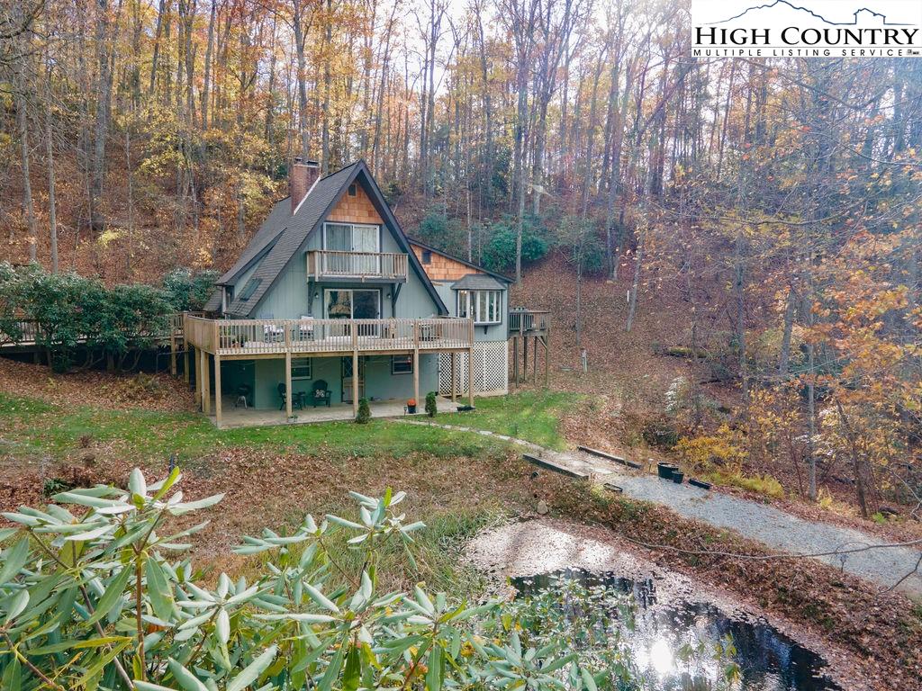 Built in the 1970s, this 4-bedroom, 3-bath home sits on 1.1 acres and has been thoughtfully maintained and improved with: new septic system and drain field (2025), new well pump (2025), freshly painted exterior (2024) new windows (2024), whole house filtration system (2025), new roof (2020), new HVAC (2020), updated bathrooms, appliances, and fixtures throughout. The main level offers an open, welcoming layout with a family room centered around a large brick fireplace, wood burning stove followed by another open living room. The dining area flows into the kitchen which features granite countertops, updated appliances, and abundant natural light from the new windows. This level also includes a spacious laundry room, one guest bedroom, and an additional room that would make a great office or study. This main floor has a large wrap around porch & side deck which makes living inside & enjoying outside seamless. Upstairs, you’ll find two bedrooms with unique cathedral style ceilings and a full updated, bath. The front master bedroom has its own balcony overlooking the pond. The lower level includes a basement apartment with approximately 800 square feet of living space — complete with its own entrance, living room, kitchen, bedroom, bathroom, washer/dryer setup, and fireplace. This space has been a consistent rental of $900/month, offering excellent potential for income or additional family members. Additional highlights include a large dry storage area beneath the home, a flower garden, firewood storage, and a campfire pit. With its versatility, location, and mountain charm, this property is ideal as a full-time residence, vacation home, or investment opportunity with easy access (approximately 18 minutes) to Boone and West Jefferson.