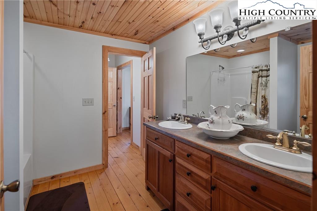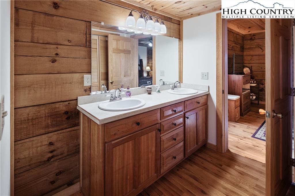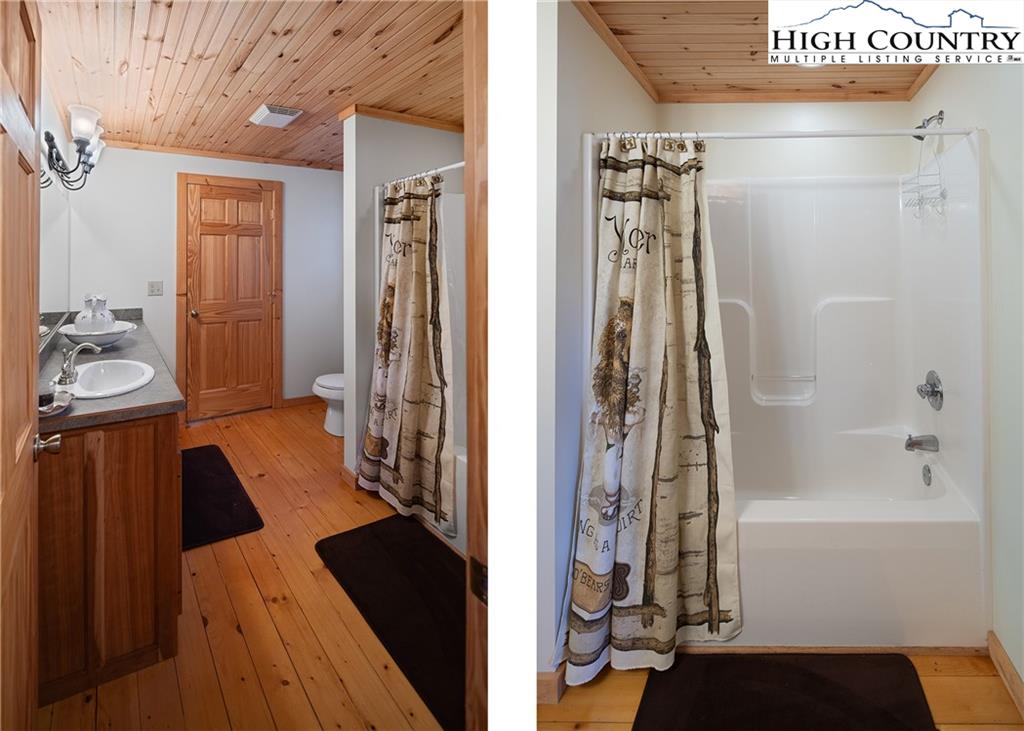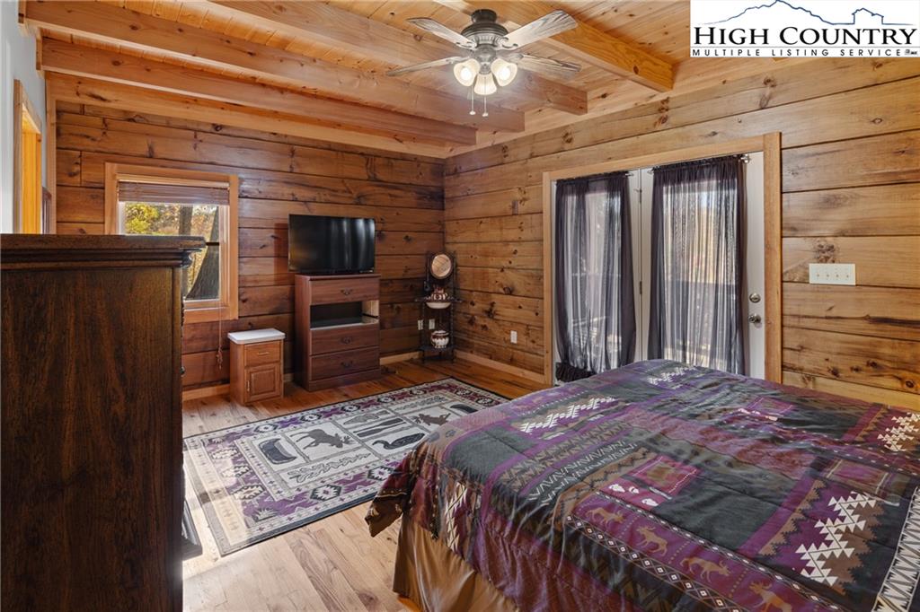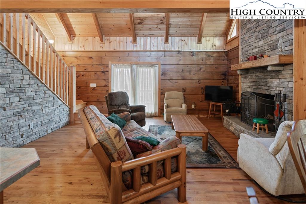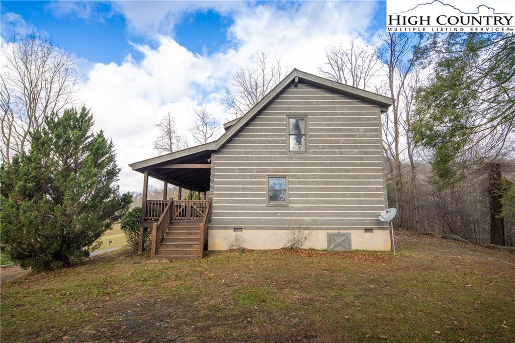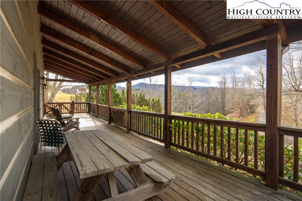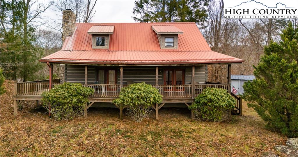 Beautiful log home with mountain views, wood burning fireplace, fully furnished, and located just around the corner from a public access on the Watauga River! Fantastic location only 20 minutes to Boone or Watauga Lake and 30 minutes from area ski resorts, every adventure in the High Country is just right down the road! Would make a fantastic primary or vacation home or a superstar for short term rental investment. Step onto the covered porch with beautiful mountain views and into the main living area with soaring tongue and groove ceilings with beam accents. Cozy stone wood burning fireplace with wormy chestnut mantle adds that rustic mountain charm that dreams are made of on a chilly night. Open flow from the living area to the kitchen with the laundry and a half bath in the hall. Primary suite on the main level accesses the front covered porch and has a spacious ensuite bath with double vanities and shower with separate jetted tub. Upstairs is another spacious bedroom with large closet and jack and jill access to another full bath with double vanity and tub shower. Large loft area overlooks the living area and could be utilized for another bed or office area or both! Come and see one of the most affordable a beautiful log cabins on the market today and be in by Christmas!