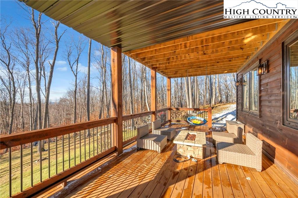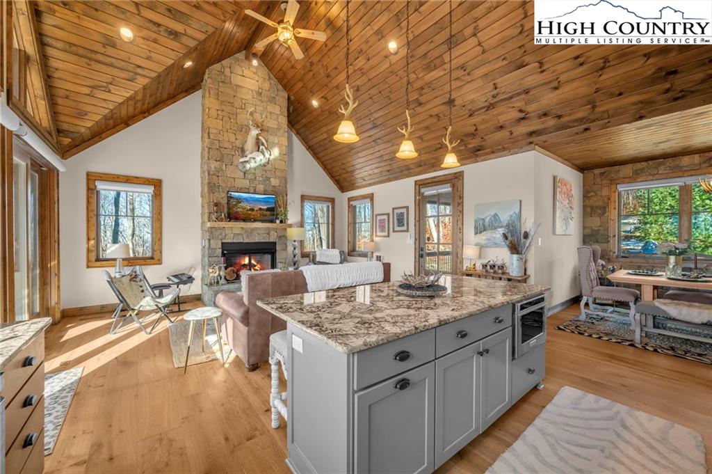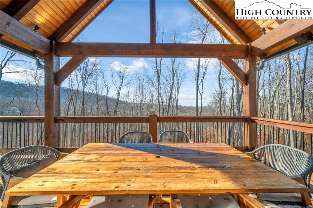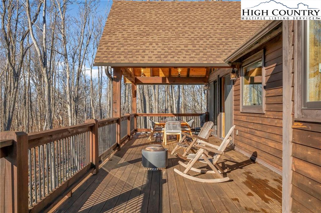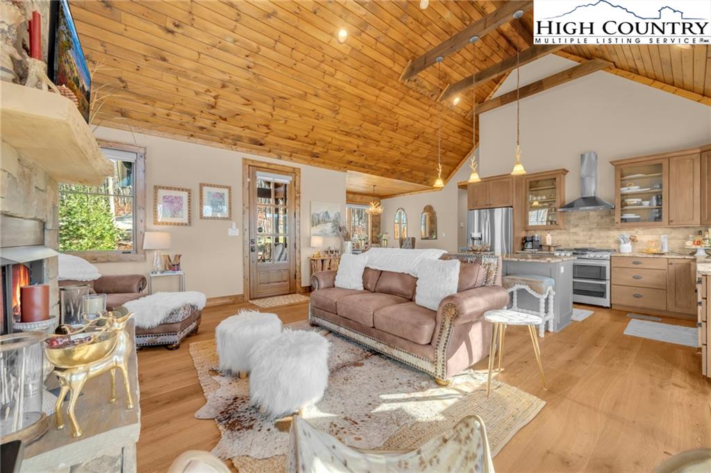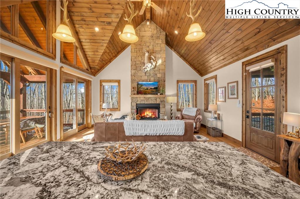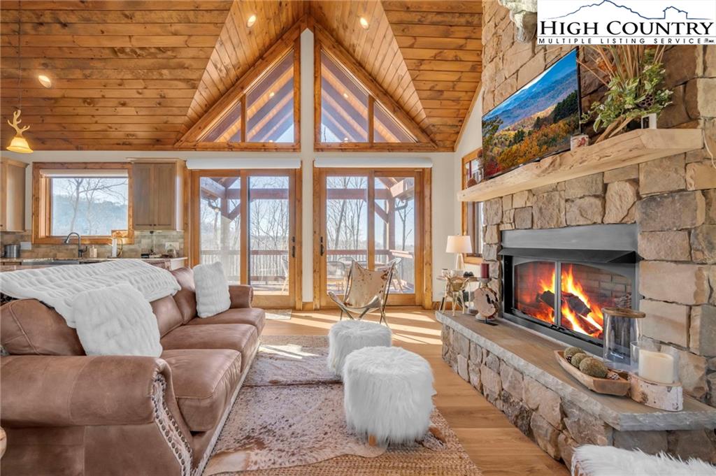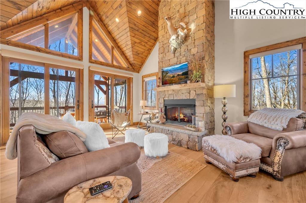 Experience exceptional mountain living in this custom-crafted retreat in The Lodges at Eagles Nest built by Vogel Builders—one of the closest homes in the community to Beech Mountain Ski Resort and just steps from the Beech Mountain gate, premier trails, and amenities. Thoughtfully designed and situated at approximately 4,300 feet of elevation, this 3-bedroom, 2-full and 2-half bath home offers seasonal long-range views, mountain views, dramatic sunsets, and the privacy of a 1.74-acre wooded setting. From the moment you arrive, the home's blend of rustic architecture and refined modern finishes sets it apart. Timber-frame beams, natural stone accents, and expansive glass highlight the surrounding mountain landscape. The main level features a vaulted great room anchored by a floor-to-ceiling stone fireplace, seamlessly connected to the dining area and a designer kitchen with custom cabinetry, premium appliances, and elegant lighting. The main-level primary suite provides a tranquil escape with vaulted ceilings, a spa-inspired bath, and direct access to the deck for enjoying the cool mountain air. The lower level is designed with comfort and hospitality in mind, featuring a spacious second living room with a wet bar and game area, a dedicated bunk room, a guest bedroom, a half bath, a full bath, and a laundry area, an ideal layout for hosting family and friends or maximizing short-term rental potential. Both levels open to expansive decks that invite year-round indoor-outdoor living. Outdoors, you’ll also enjoy a beautiful firepit area and a rare, gently sloping yard with usable space. This home offers an exceptional location within the Lodges at Eagles Nest, positioned directly beside the Beech Mountain gate. Walk or ride to Camp Eagles Nest, which features tennis courts, pickleball courts, playgrounds, and more. With Beech Mountain Ski Resort only 2.3 miles away, winter sports and summer recreation are easily accessible. At the Lodges at Eagles Nest, residents enjoy a wide range of amenities. The amphitheater hosts live summer concerts from May to October, while the Epic Chophouse offers exceptional dining nearby, along with convenient access to Dollar General for quick essentials. Outdoor enthusiasts can explore miles of hiking, biking, and ATV trails, as well as pickleball, tennis, basketball, and soccer courts. Additional activities include climbing towers, an 18-hole putt-putt course, and the popular Eagles Nest Winery, perfect for relaxing with wines and stunning views. Both short-term and long-term rentals are permitted, offering excellent investment flexibility. A stunning blend of luxury, adventure, and mountain serenity, this home stands out as one of the most desirable offerings in Eagles Nest.