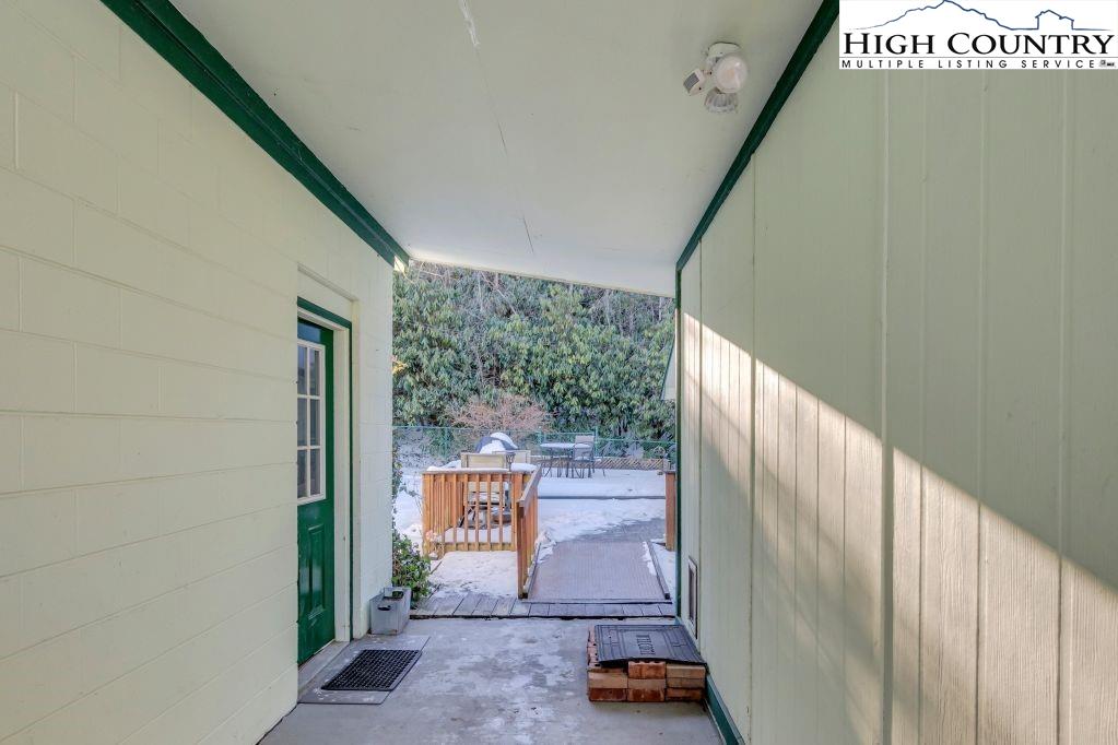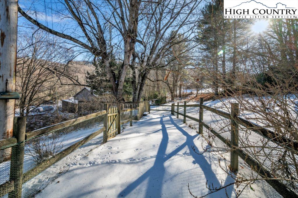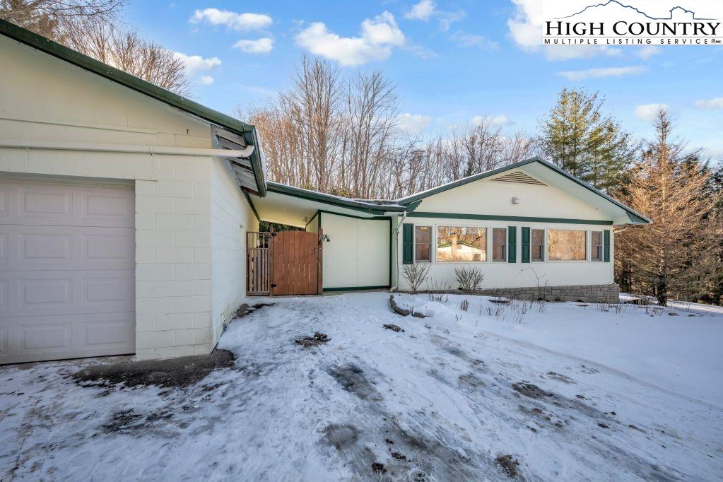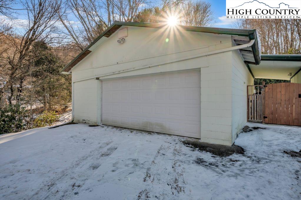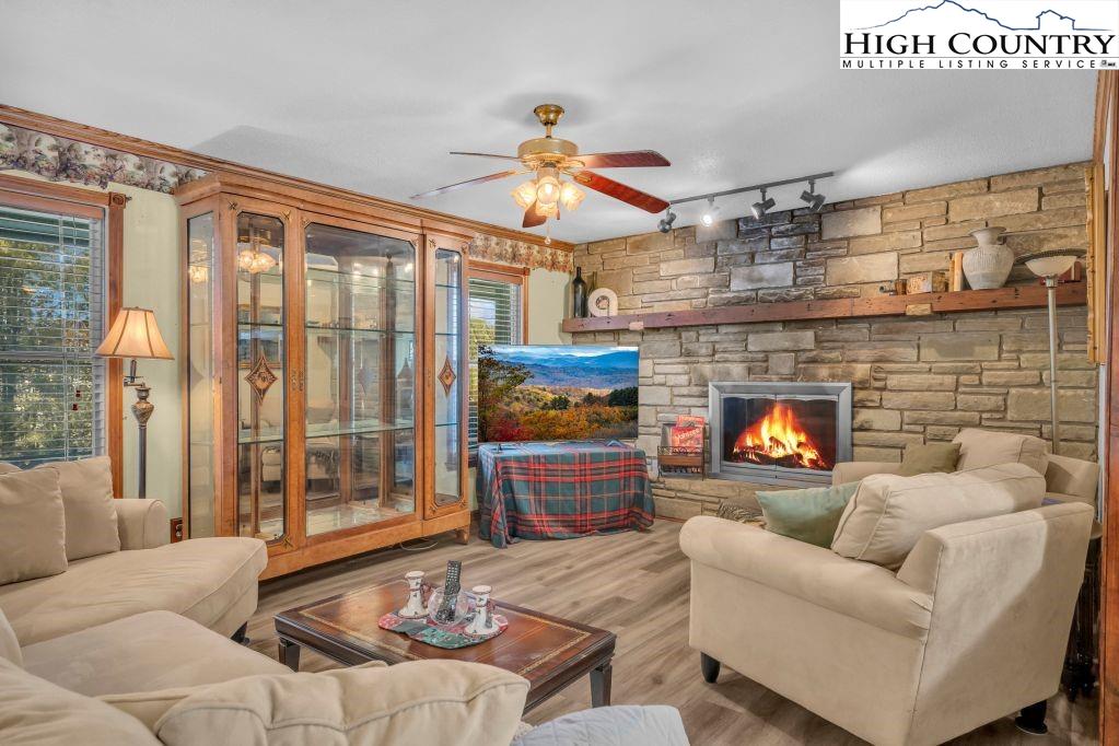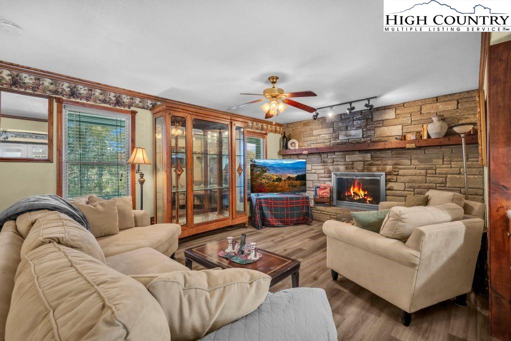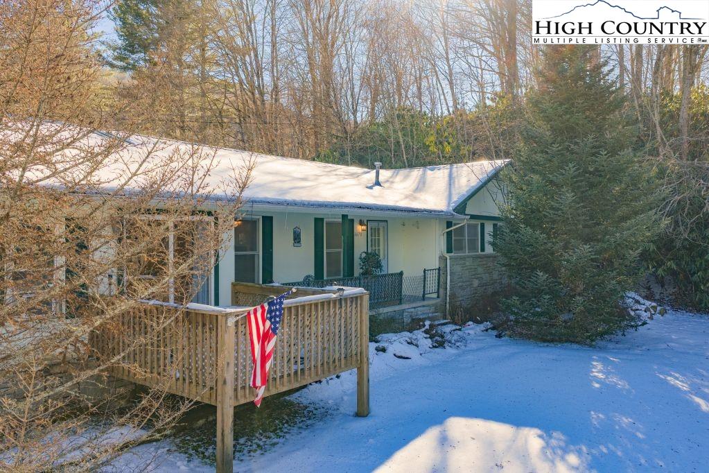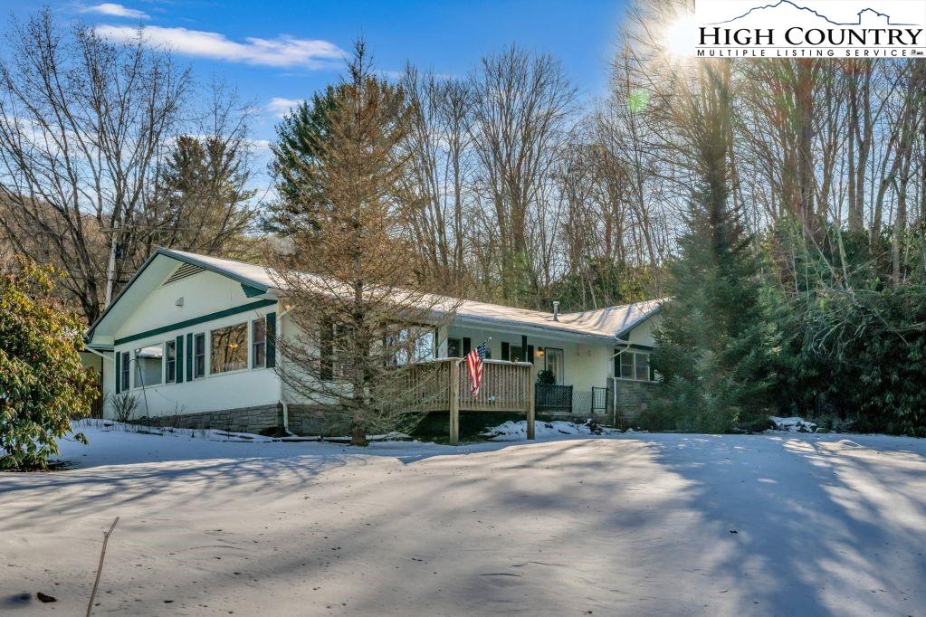 Less than five minutes from downtown Banner Elk, Lees-McRae College and Sugar Mountain, this single-level ranch residence offers location, flexibility and privacy on a park-like, flat 1.57-acre setting. While officially listed as a three-bedroom home, the layout provides four distinct sleeping areas, including a versatile guest suite off the kitchen with its stone fireplace, full bath, walk-in closet, private deck and abundant natural light, ideal as a second primary suite, in-law space or bonus living area. The open kitchen and dining area flow into the main living room, which features a second stone fireplace crafted from Grandfather Mountain stone. French doors lead to a large rear deck overlooking the fenced backyard, garden space and wooded edge. The same Grandfather Mountain stone is used on the exterior, adding timeless character and regional significance. One bedroom is used as a laundry room and can be easily converted back. The unfinished basement offers a second laundry area, abundant storage and space for a gym, studio or workshop. Outdoor living is unmatched, with a covered front porch, expansive back deck, stone path to a creekside platform beneath a mature shade tree, and ample room for gardening or small livestock. A heated, detached two-car garage with workshop or office is connected by a covered breezeway. Additional features include accessible design elements and a high-efficiency HVAC system with advanced air filtration. A rare opportunity combining convenience, unrestricted usable land and flexible living space, minutes from everything Banner Elk and the High Country have to offer.